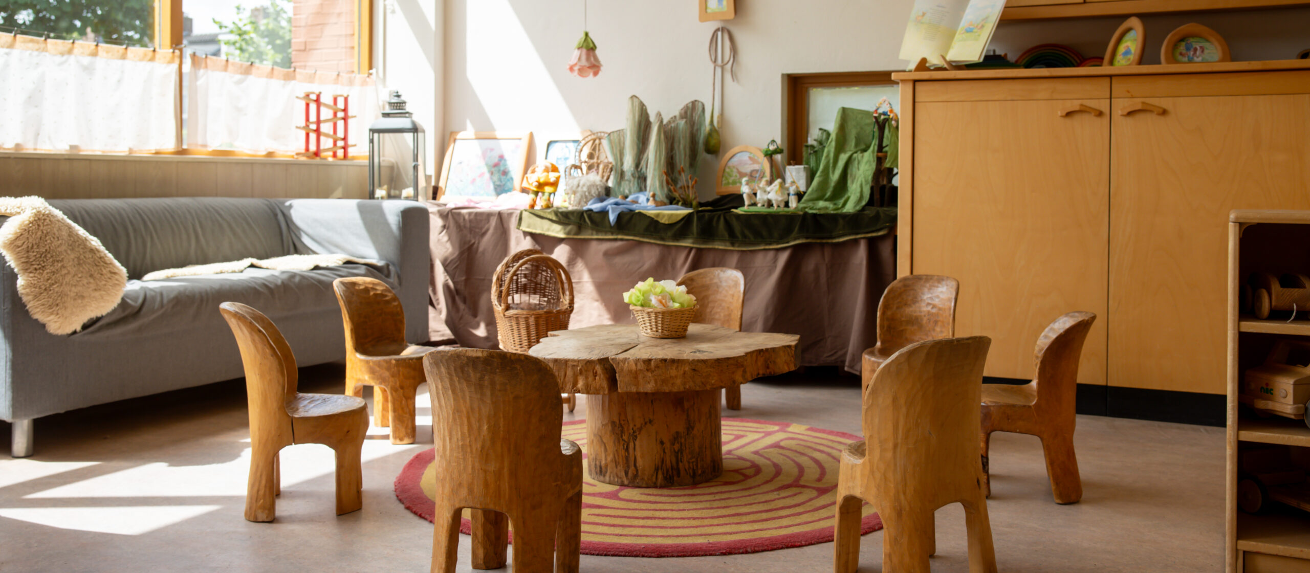 - De groepsruimte is ingericht met houten meubels, natuurlijke materialen en een seizoenstafel.